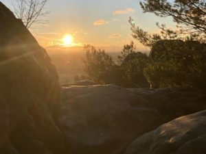 Best een aangenaam rondje zo door de wijngaarden van het Hof van Twente en over de Benteler Es. Onze route volgt de Hagmolenbeek langs de wijnranken en de hond mag van de lijn. Er is een voetveer voor als je naar het wijnhuis wilt. Wij lopen vanaf de Hagmolen richting de es en onderweg maken we een kleine detour over de heide, want dat is een erg leuk snuffelstukje voor de hond. Elsa snuift zich een weg over de heide en spitst de oren bij het minste geluidje. We vinden takjes en dennenappels en daar wordt mee gespeeld.
