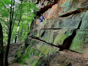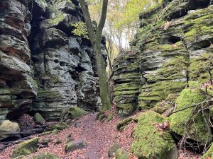 De Dörenther Klippen behoren tot de bergjes van het Teutoburgerwoud en die zijn tot zo’n dikke 300 meter hoog. Dus hoogtemeters maken kan! Dat voel je ook op deze wandeling. We trainen de beenspiertjes op het pad omhoog en nemen even pauze op een bankje met nog een klein uitzichtje op het Bocketal.