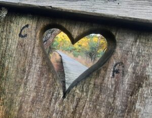 We blijven lopen over mooie heidepaadjes. Sommige heel smal en midden tussen het paars. Dan stappen we het bos in bij de dikke steen in de kuil. Een overblijfsel uit de ijstijd, dus oud is deze joekel.