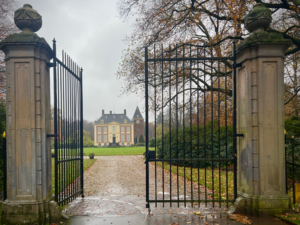 Aan de andere kant van het erf wandel ik de tuin weer uit en daar ben ik even het spoor bijster. De ijzeren loopbrug op de plek van de oude watermolen, moet dichtbij zijn. Even zoeken… en dan kom ik uit bij het ijzeren waterrad en de ijzeren brug over de beek.