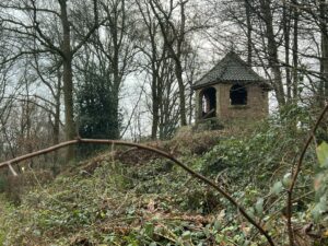 Ik ben blij dat ik mijn warme winterjas heb aangetrokken. Als ik de autodeur open, waait de koude wind me in het gezicht. Het is guur en grijs. Elsa blaft enthousiast, zij heeft er alvast zin in. Ik steek direct de Hooidijk over om richting Hoeve Springendal te gaan. Het is een smal kronkelpaadje dwars door het bos. Je wandelt over ‘oale groond’, want de heuvels die je kunt zien, zijn prehistorische grafheuvels.