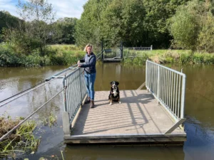 Ik neem niet de rechte lijn terug naar het kasteel, maar kies voor een kleine extra ronde door het bos. Elsa kan dan nog even met de pootjes in het water. Dan gaan we door naar het kasteelpark. Ik wandel langs de standbeelden met allerlei thema’s en uit alle tijden. Leuke wandeling! En nu weer terug naar het heden.