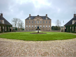 Ik volg de groene route van 5 km (volgens komoot 4,2) over het landgoed en wandel eerst langs de moestuin waar hard gewerkt wordt om de grond klaar te maken voor de groentebedden. Ik zie nog wat wintergroente staan. Handig, gewoon volgens de seizoenen. Zoals vroeger.