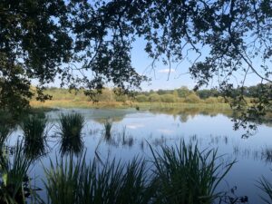 Wat een ongelofelijk strakke paden tref ik hier op het landgoed. Echt super onderhouden en zo gelijkmatig als maar kan. Het enige asfalt onder de voeten is bij het oversteken en een mini verbindingsstukje op de ronde. De route loopt verder naast de weides en door de bossen. Wat een uitzicht over de velden waar de hoeves als een soort van paddenstoelen tussen liggen.