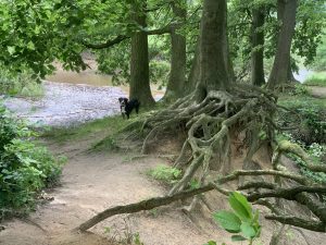 We wandelen verder door flink begroeide velden en zo het bos weer in. We staan alweer bij een zandstrandje waar vooral veel honden spelen. Ontelbare pootafdrukken zijn er te zien. Elsa pakt nog even wat stokken uit het water. Ze wil een enorm lang exemplaar meenemen. Te breed voor het pad, zelfs als ze ‘m schuin houdt past ie niet op het smalle varenpaadje. Ze laat ‘m toch maar achter en vist ergens een ministokje op, waar ze trots meer rondwandelt.