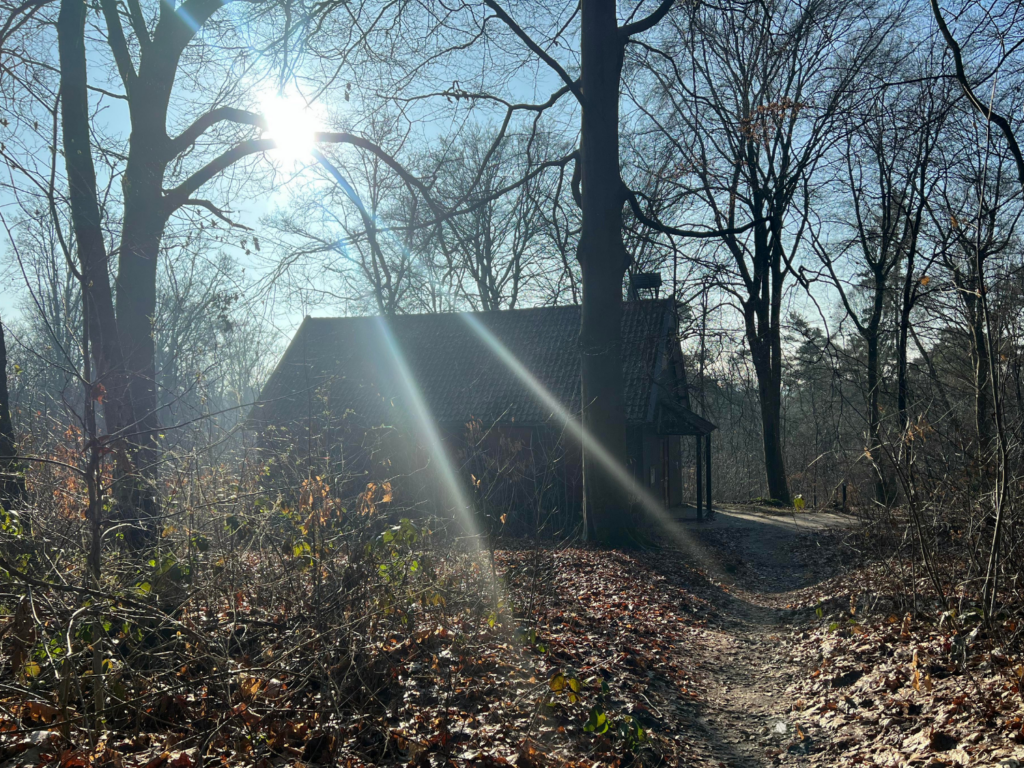 Binnen twee stappen sta ik in het bos. Ik heb mijn auto geparkeerd bij eetcafé de Kaleberg. Handig voor wie met een volle maag wil beginnen of de wandeling wil afsluiten met een welverdiende maaltijd. Elsa en ik gaan direct op pad. Stoer sprinten we het bostrappetje op, richting de Boskapel. Daar gaat mijn hart altijd sneller van kloppen. Het kan aan de plek liggen met de mooie paadjes. Of misschien gewoon aan mijn belabberde conditie.