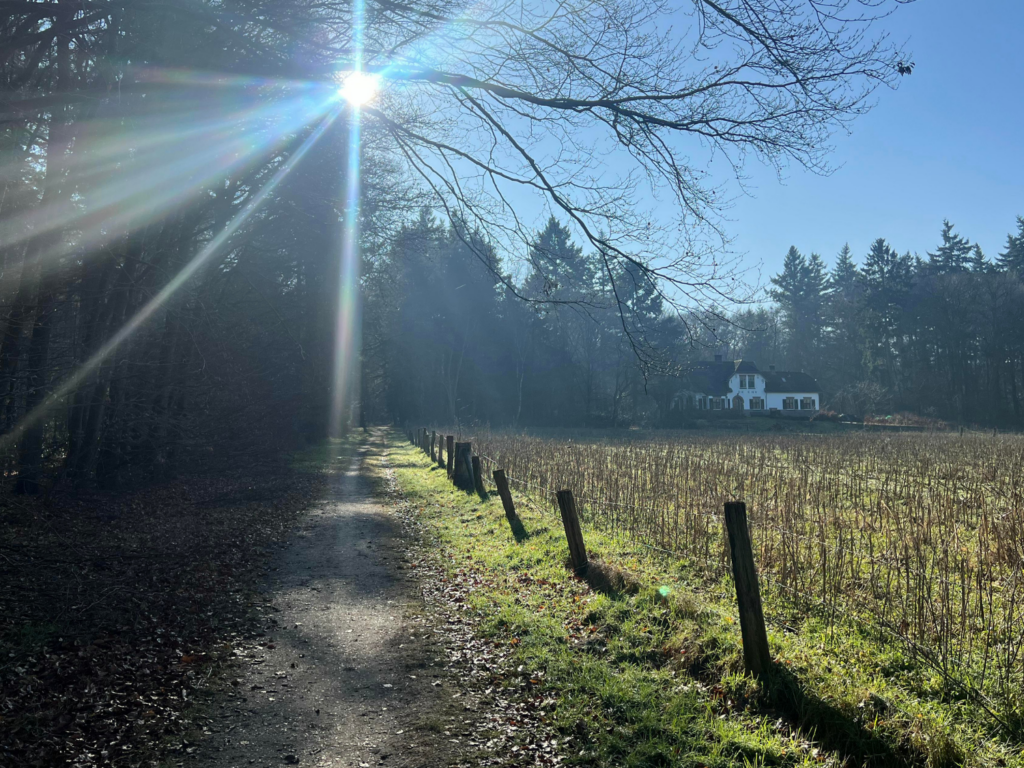 Er volgt nog een prachtig stukje heuvelachtig bos. Diep uitgesleten wandelpaden en brede zandwegen wisselen elkaar af. Dan opent het landschap zich opnieuw en staat daar ineens een huisje met een statige beukenoprijlaan midden tussen de weides. Het is de Boswachterswoning. Wow, wat staat die op een prachtige plek.