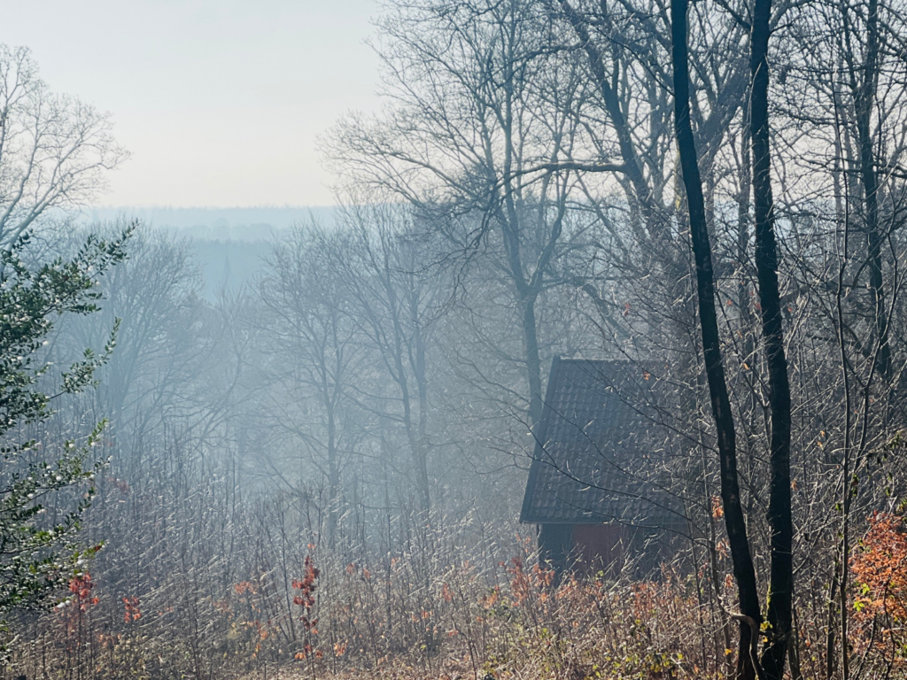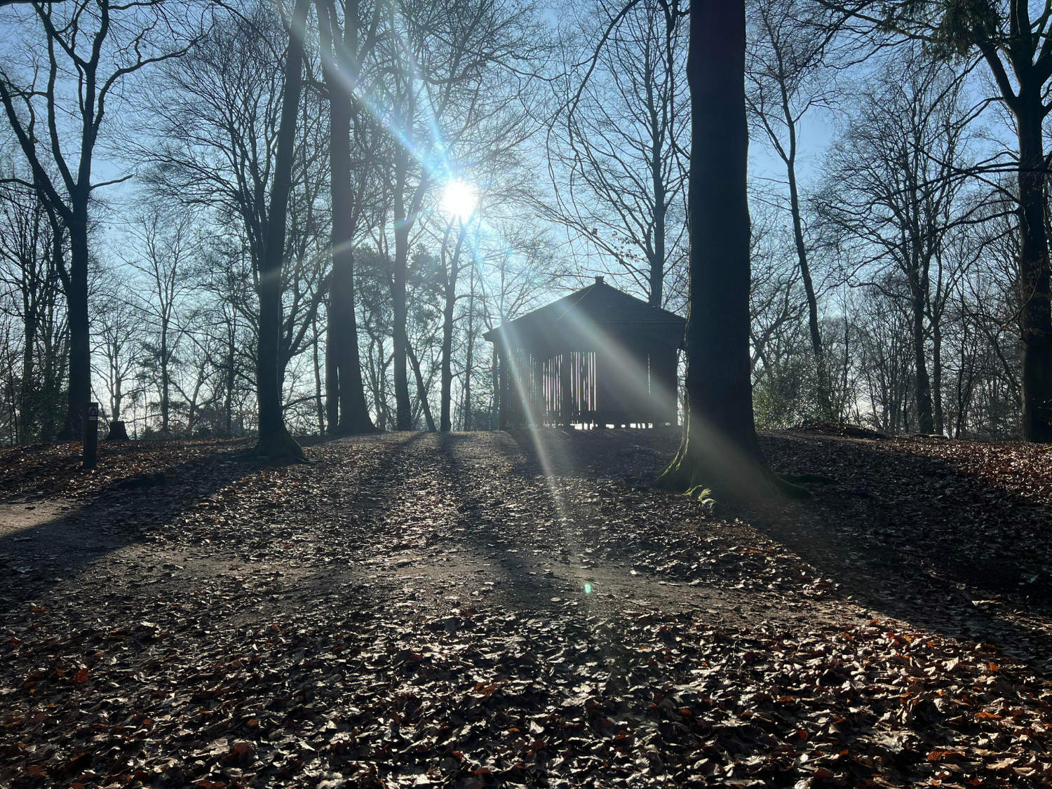 Daarna gaan we verder omhoog. Bovenop de Kaleberg staat een nieuwe ‘oude schuilhut’. Vroeger werd er ook al veel gewandeld. Dit hutje is nagebouwd naar het voorbeeld van 100 jaar terug. Kijk dan hoe die zon door de bomen schijnt – prachtig lichtspel! Vanaf het hutje kun je heel ver kijken. Ik zag de contouren van Borculo. Pauze houden kan natuurlijk ook.