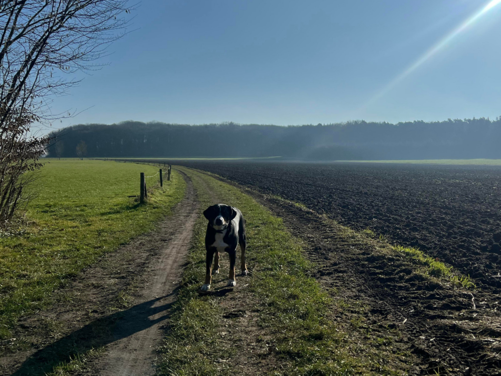 Zojuist kwam ik langs de mooiste pauzestop: een bankje in de zon aan de rand van het uitgestrekte veld. Keuze uit meerdere plekjes. ik heb het er even van genomen, lekker warm in de zon. Daarna vervolgden we onze route over stille wandelpaadjes door het bos om uiteindelijk op de uitgestrekte Enk uit te komen. Elsa mag van de lijn en wil graag even rennen over de paden mét stokjes.