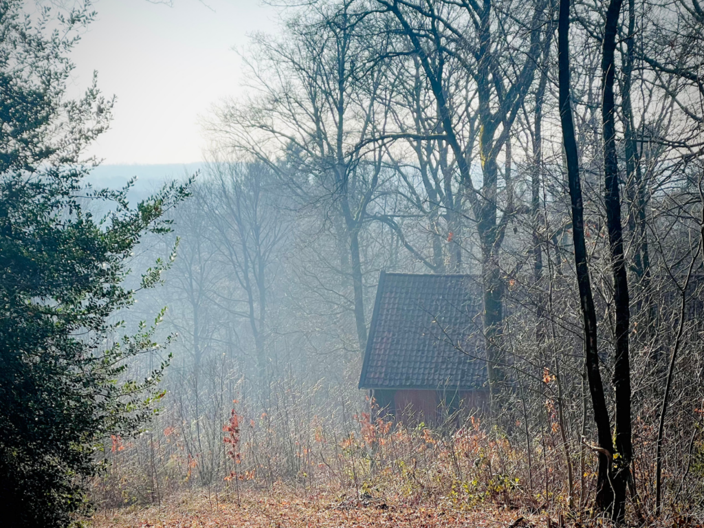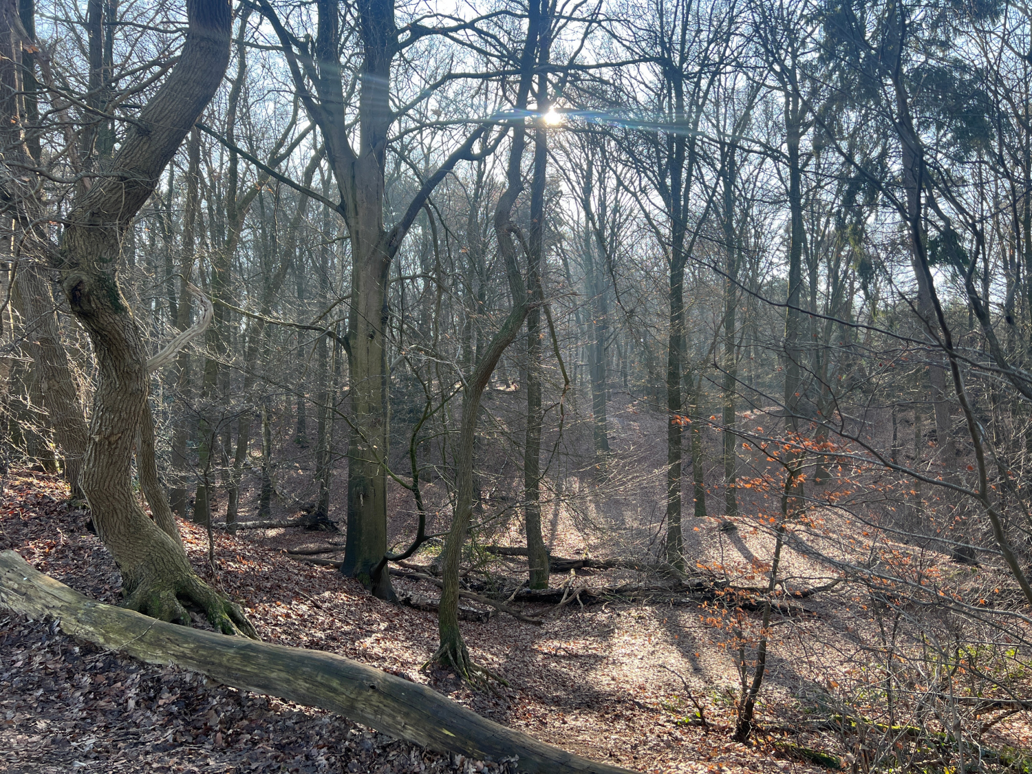 De zon straalt tussen de bomen door. De lucht is strakblauw, een tikje heiig, waardoor het bos net wat geheimzinniger oogt. De houten Boskapel ligt hier prachtig verscholen. Loop je nog een stukje verder omhoog, dan sta je bovenop de Kaleberg. Ik heb een grote glimlach – zo mooi! Elsa is druk met het spotten van stokjes. Ze gaat ongetwijfeld weer een verzameling meenemen op de wandelronde.